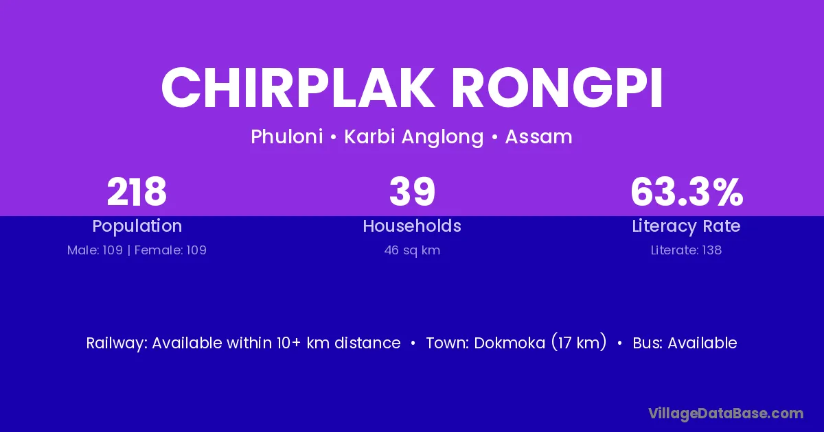 Chirplak Rongpi village has a total population of 218 people, of which 109 are males and 109 are females.