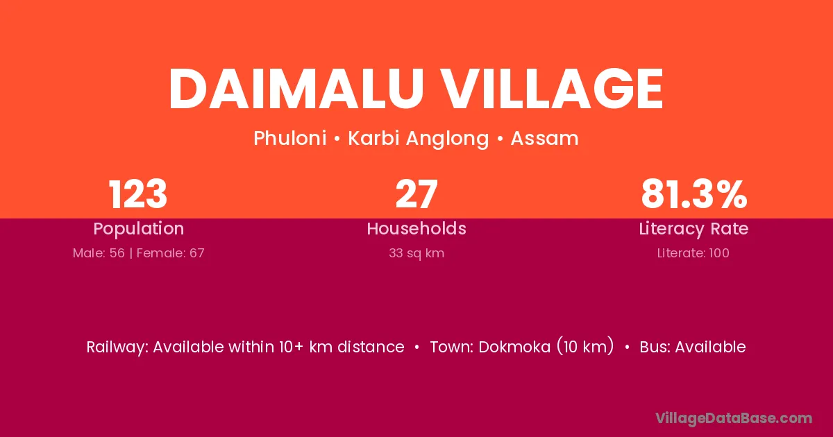 Dokmoka (10 km) is the nearest town to Daimalu Village village for major economic activities and is located approximately 10 km away.