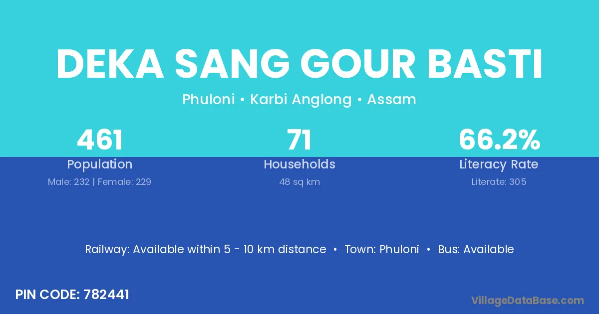 Deka Sang Gour Basti village has a total population of 461 people, of which 232 are males and 229 are females.