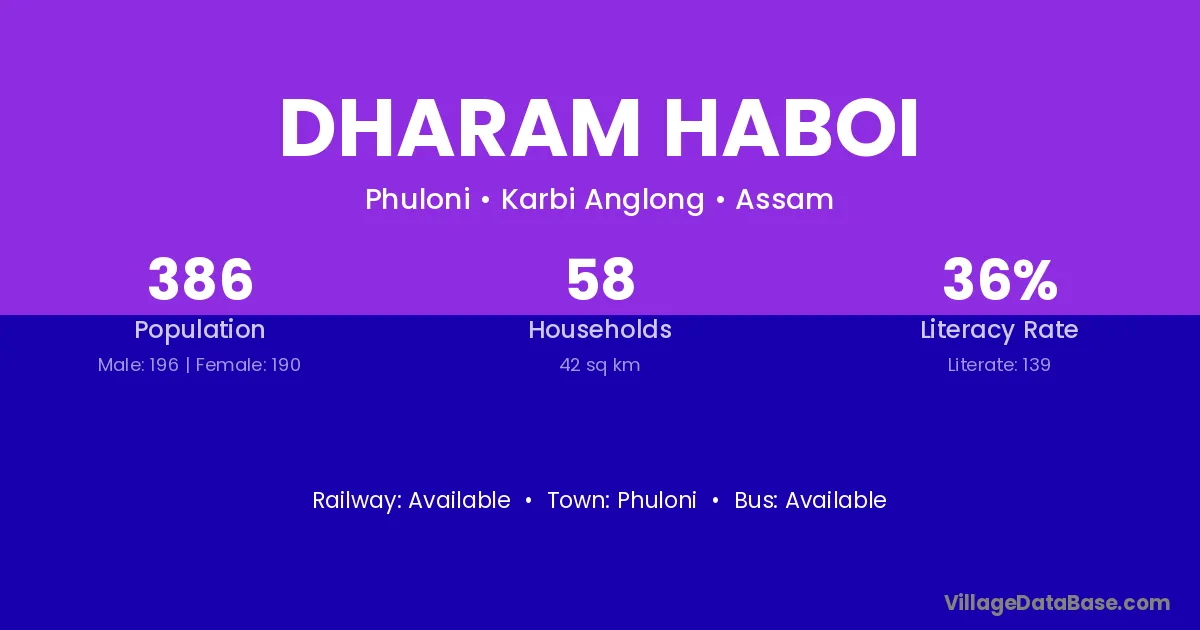 Dharam Haboi village has a total population of 386 people, of which 196 are males and 190 are females.