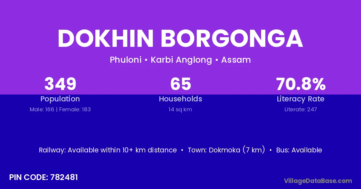Dokmoka (7 km) is the nearest town to Dokhin Borgonga village for major economic activities and is located approximately 7 km away.