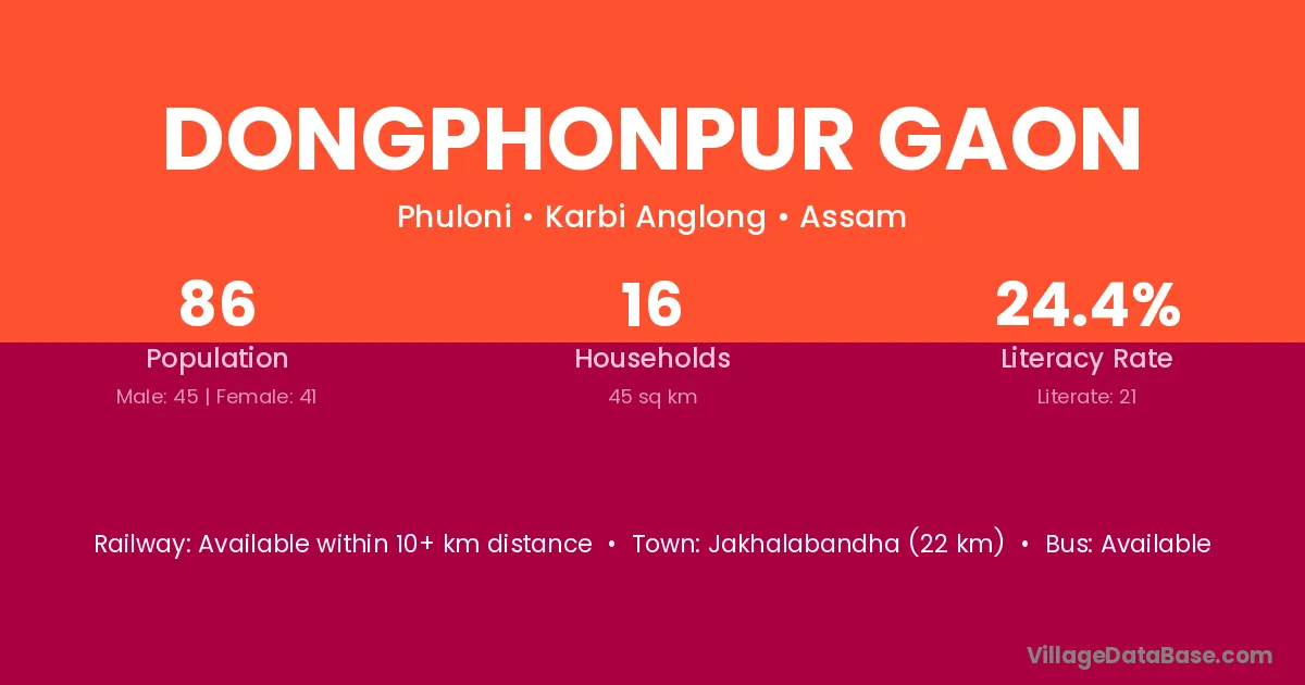 Dongphonpur Gaon village has a total population of 86 people, of which 45 are males and 41 are females.