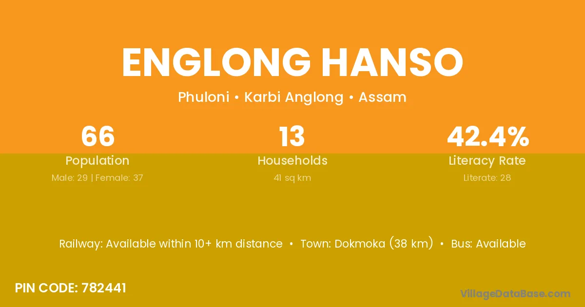 Dokmoka (38 km) is the nearest town to Englong Hanso village for major economic activities and is located approximately 38 km away.