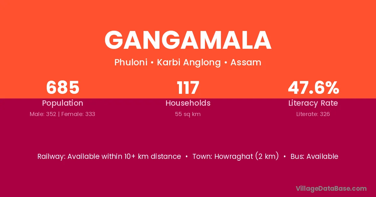 Howraghat (2 km) is the nearest town to Gangamala village for major economic activities and is located approximately 2 km away.