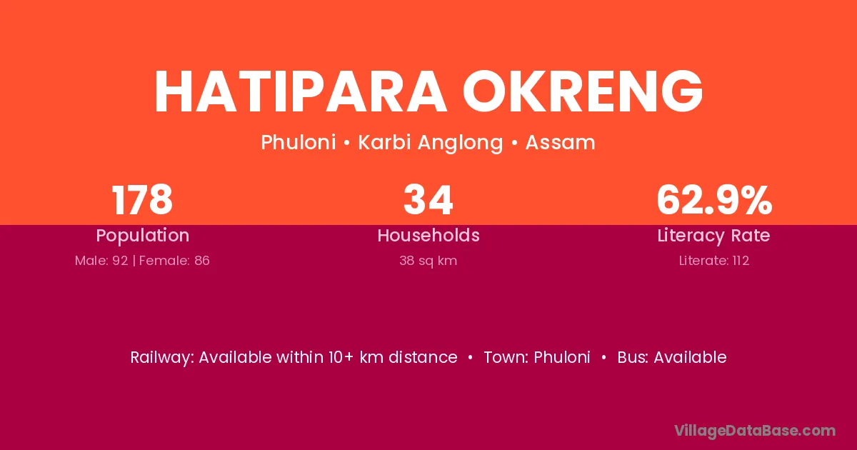 Hatipara Okreng village has a total population of 178 people, of which 92 are males and 86 are females.