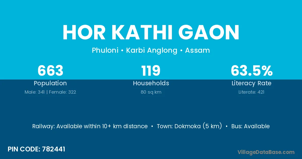 Dokmoka (5 km) is the nearest town to Hor Kathi Gaon village for major economic activities and is located approximately 5 km away.