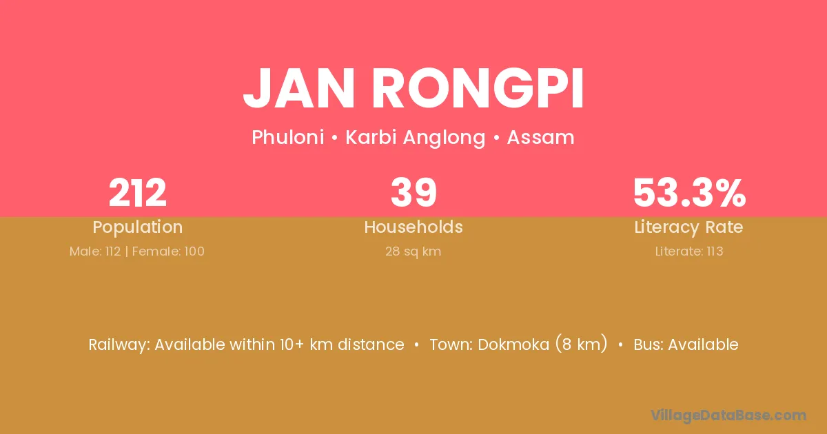 Dokmoka (8 km) is the nearest town to Jan Rongpi village for major economic activities and is located approximately 8 km away.