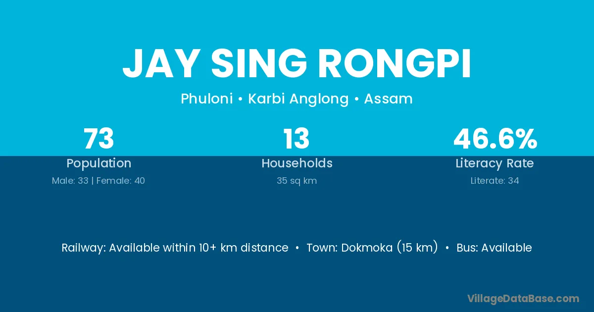 Dokmoka (15 km) is the nearest town to Jay Sing Rongpi village for major economic activities and is located approximately 15 km away.