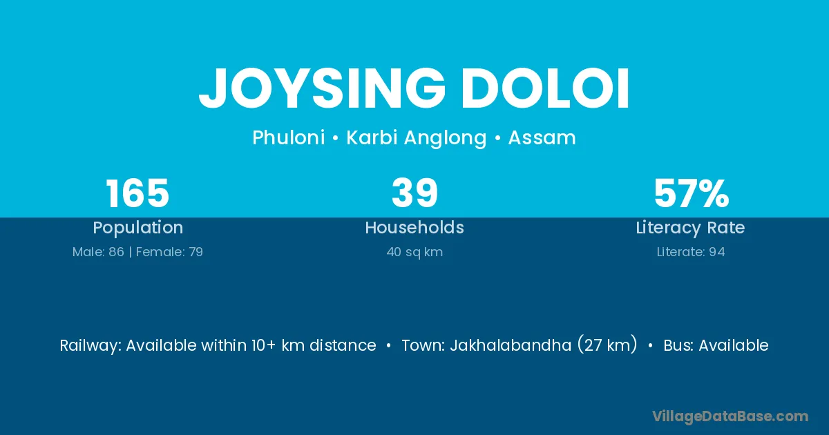 Joysing Doloi village has a total population of 165 people, of which 86 are males and 79 are females.