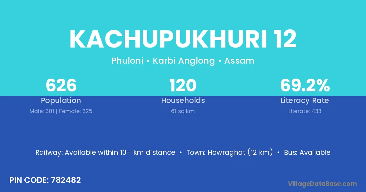 Howraghat (12 km) is the nearest town to Kachupukhuri 12 village for major economic activities and is located approximately 12 km away.