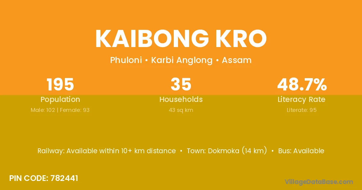 Dokmoka (14 km) is the nearest town to Kaibong Kro village for major economic activities and is located approximately 14 km away.