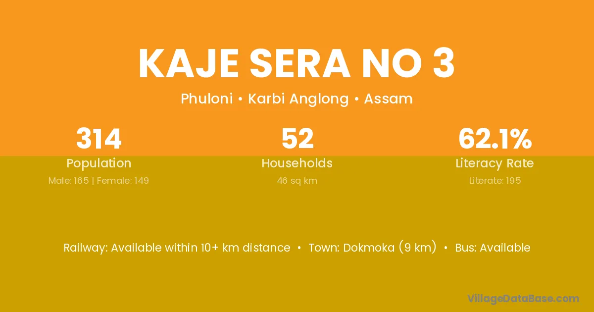 Dokmoka (9 km) is the nearest town to Kaje Sera No 3 village for major economic activities and is located approximately 9 km away.