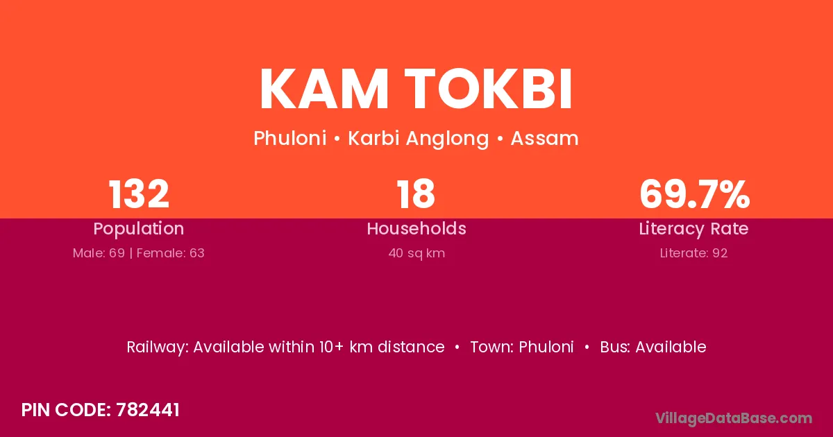 Kam Tokbi village has a total population of 132 people, of which 69 are males and 63 are females.