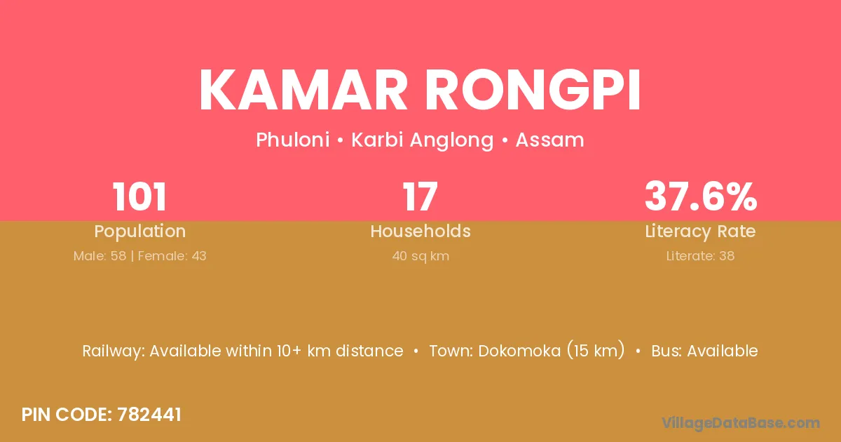 Dokomoka (15 km) is the nearest town to Kamar Rongpi village for major economic activities and is located approximately 15 km away.