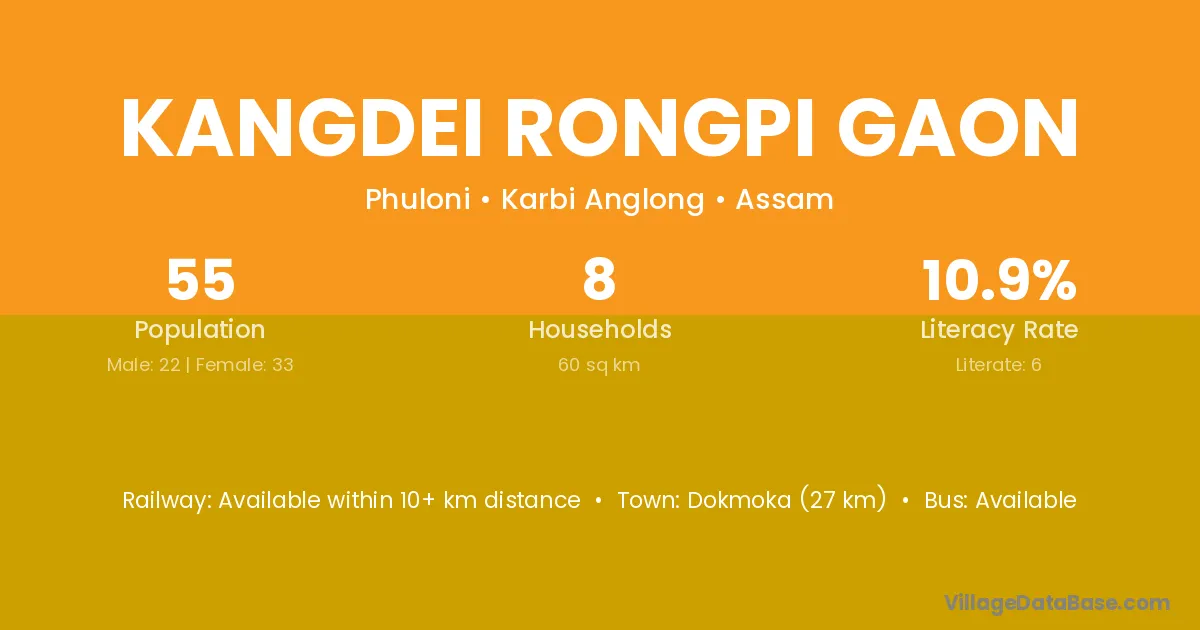 Kangdei Rongpi Gaon village has a total population of 55 people, of which 22 are males and 33 are females.