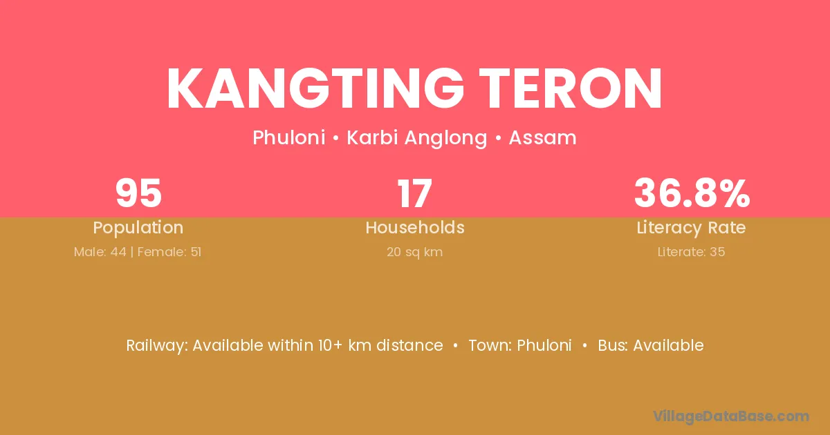 Kangting Teron village has a total population of 95 people, of which 44 are males and 51 are females.