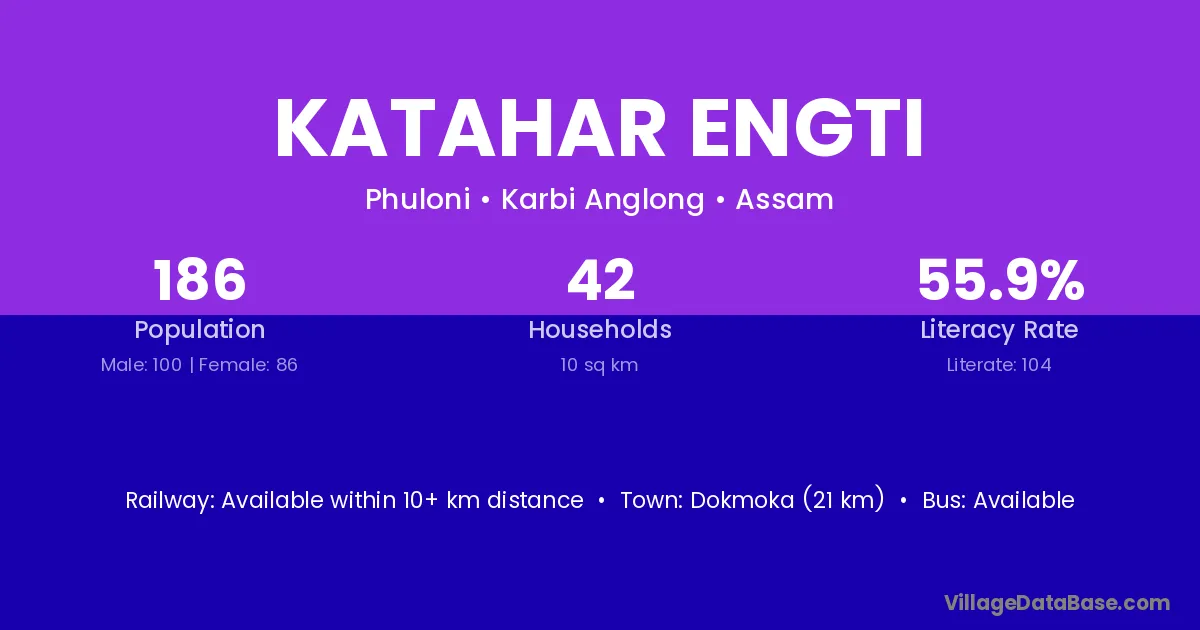 Dokmoka (21 km) is the nearest town to Katahar Engti village for major economic activities and is located approximately 21 km away.