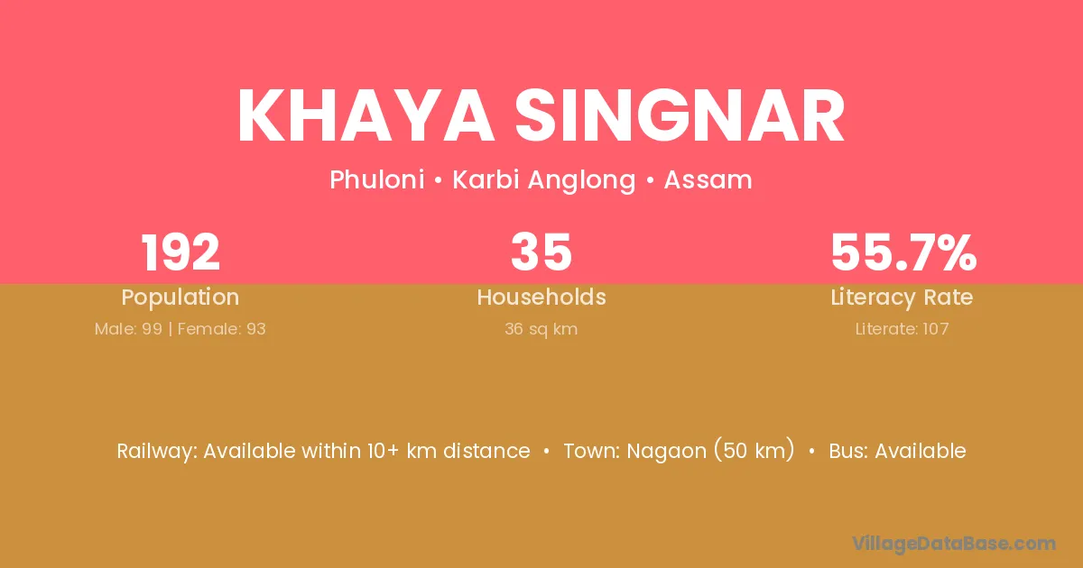 Nagaon (50 km) is the nearest town to Khaya Singnar village for major economic activities and is located approximately 50 km away.
