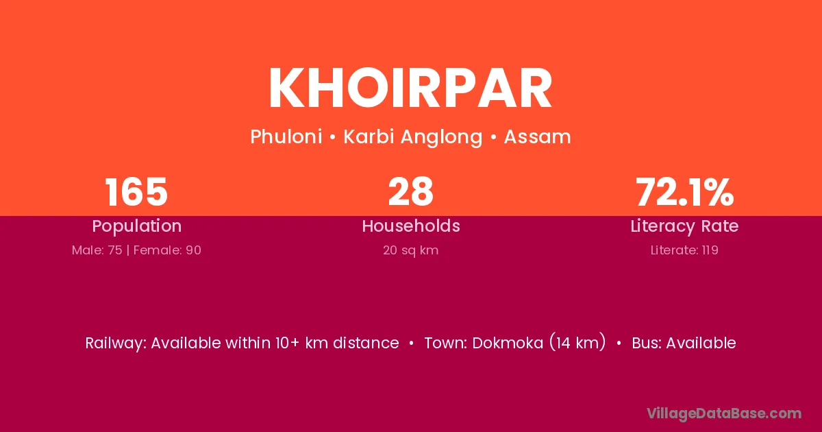 Dokmoka (14 km) is the nearest town to Khoirpar village for major economic activities and is located approximately 14 km away.