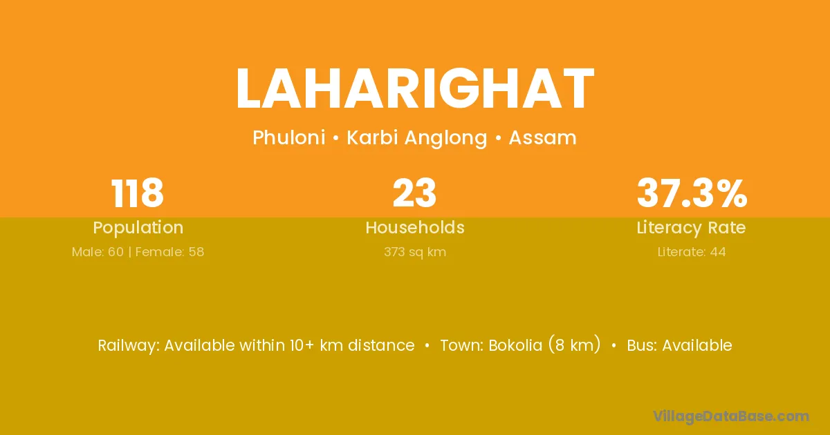 Laharighat village has a total population of 118 people, of which 60 are males and 58 are females.