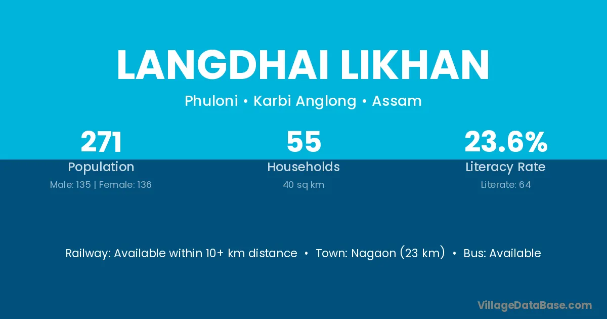 Nagaon (23 km) is the nearest town to Langdhai Likhan village for major economic activities and is located approximately 23 km away.