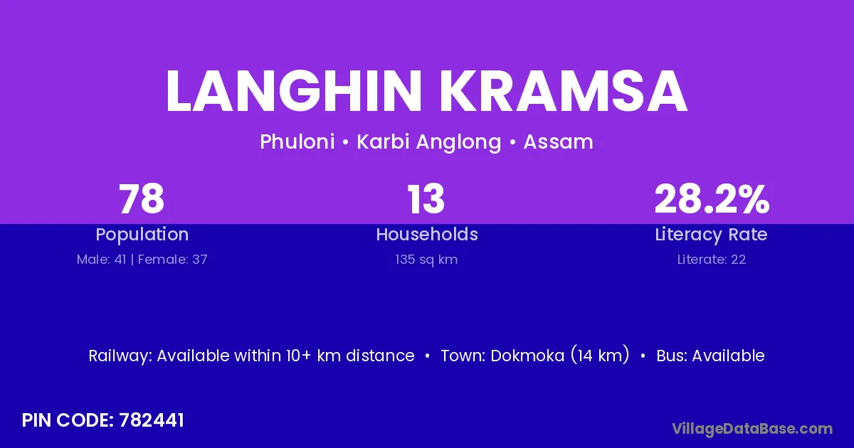 Dokmoka (14 km) is the nearest town to Langhin Kramsa village for major economic activities and is located approximately 14 km away.