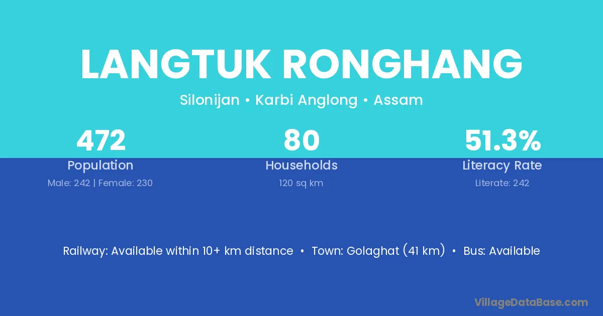 Dokmoka (20 km) is the nearest town to Langtuk Ronghang village for major economic activities and is located approximately 20 km away.