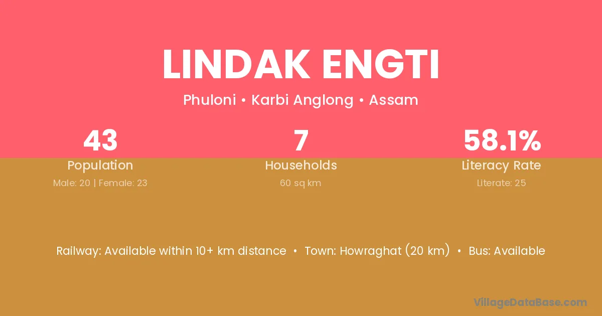 Lindak Engti village has a total population of 43 people, of which 20 are males and 23 are females.