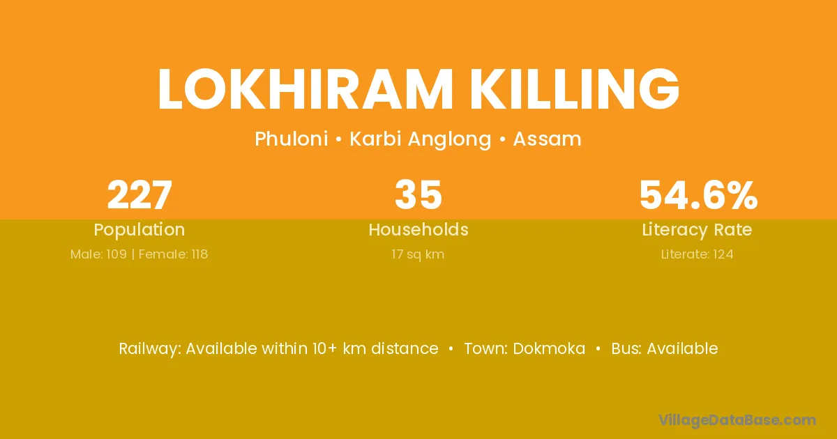 Lokhiram Killing village has a total population of 227 people, of which 109 are males and 118 are females.