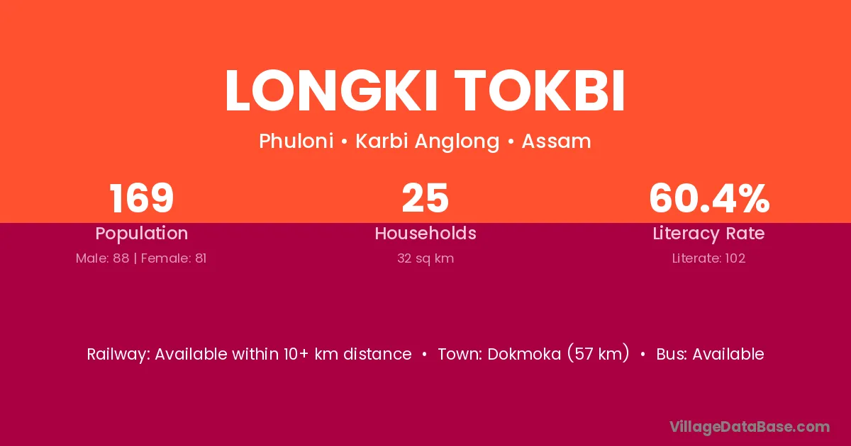 Longki Tokbi village has a total population of 169 people, of which 88 are males and 81 are females.