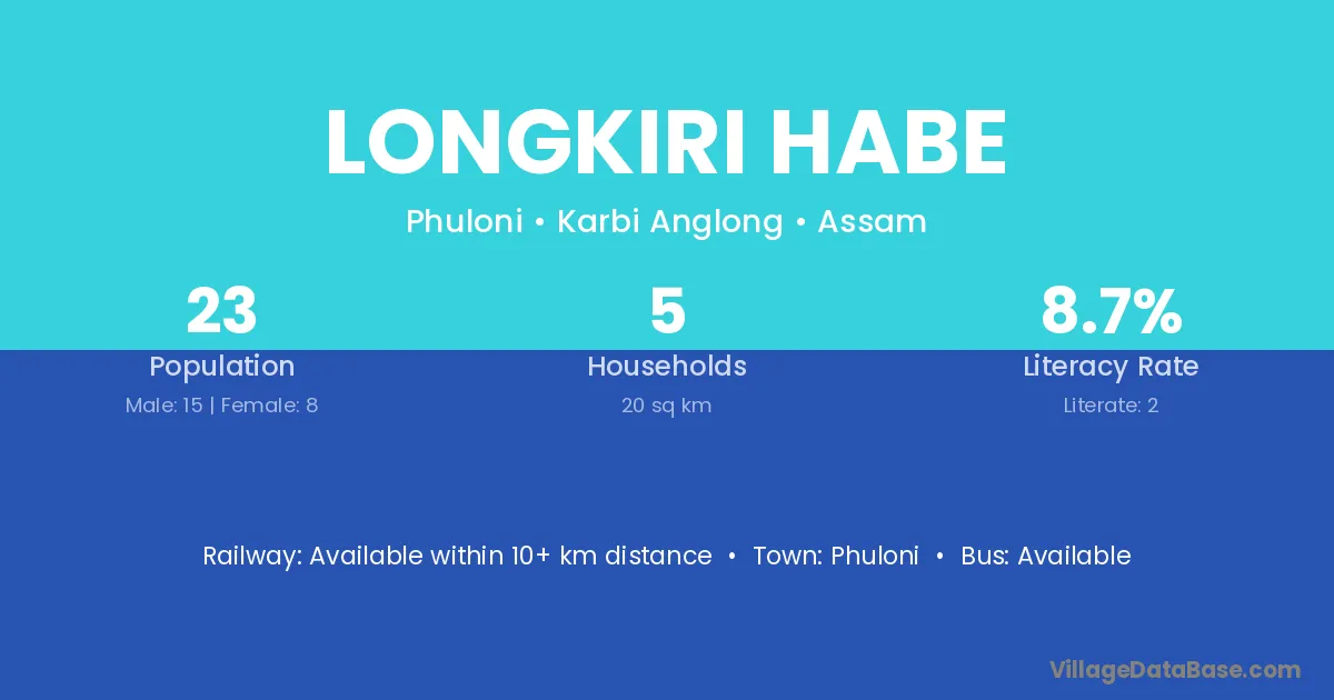 Longkiri Habe village has a total population of 23 people, of which 15 are males and 8 are females.