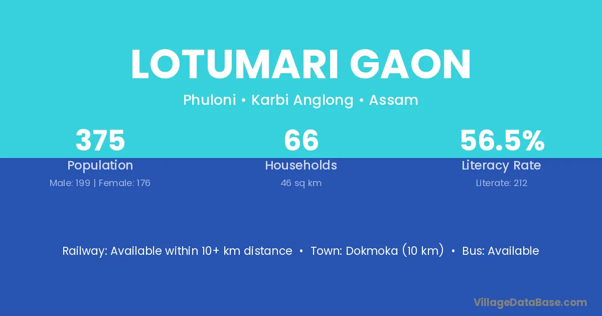 Lotumari Gaon village has a total population of 375 people, of which 199 are males and 176 are females.