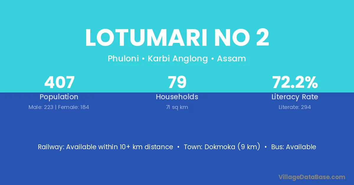 Dokmoka (9 km) is the nearest town to Lotumari No 2 village for major economic activities and is located approximately 9 km away.