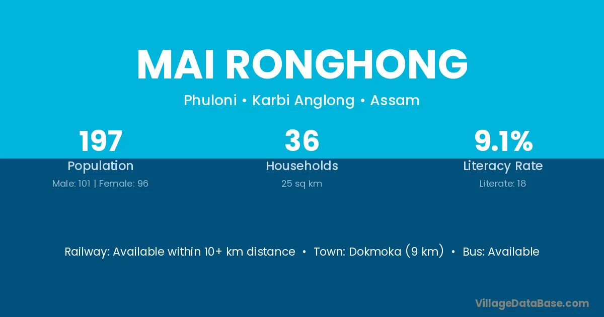Dokmoka (9 km) is the nearest town to Mai Ronghong village for major economic activities and is located approximately 9 km away.