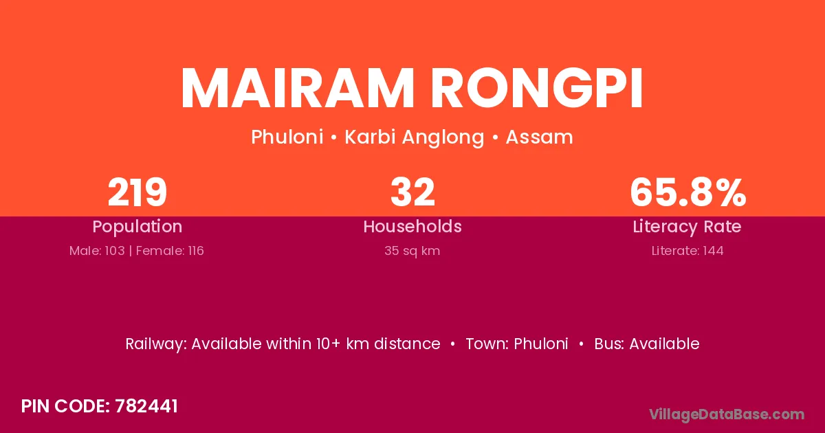 Mairam Rongpi village has a total population of 219 people, of which 103 are males and 116 are females.