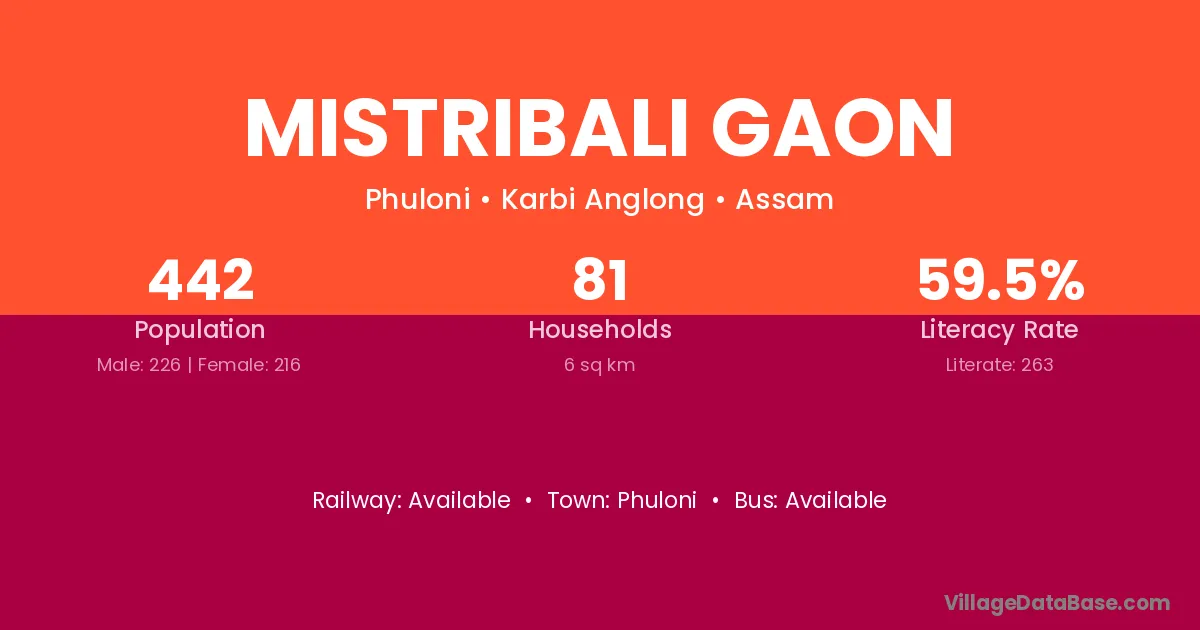 Mistribali Gaon village has a total population of 442 people, of which 226 are males and 216 are females.