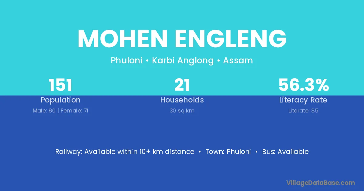 Mohen Engleng village has a total population of 151 people, of which 80 are males and 71 are females.