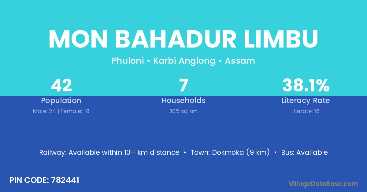 Dokmoka (9 km) is the nearest town to Mon Bahadur Limbu village for major economic activities and is located approximately 9 km away.