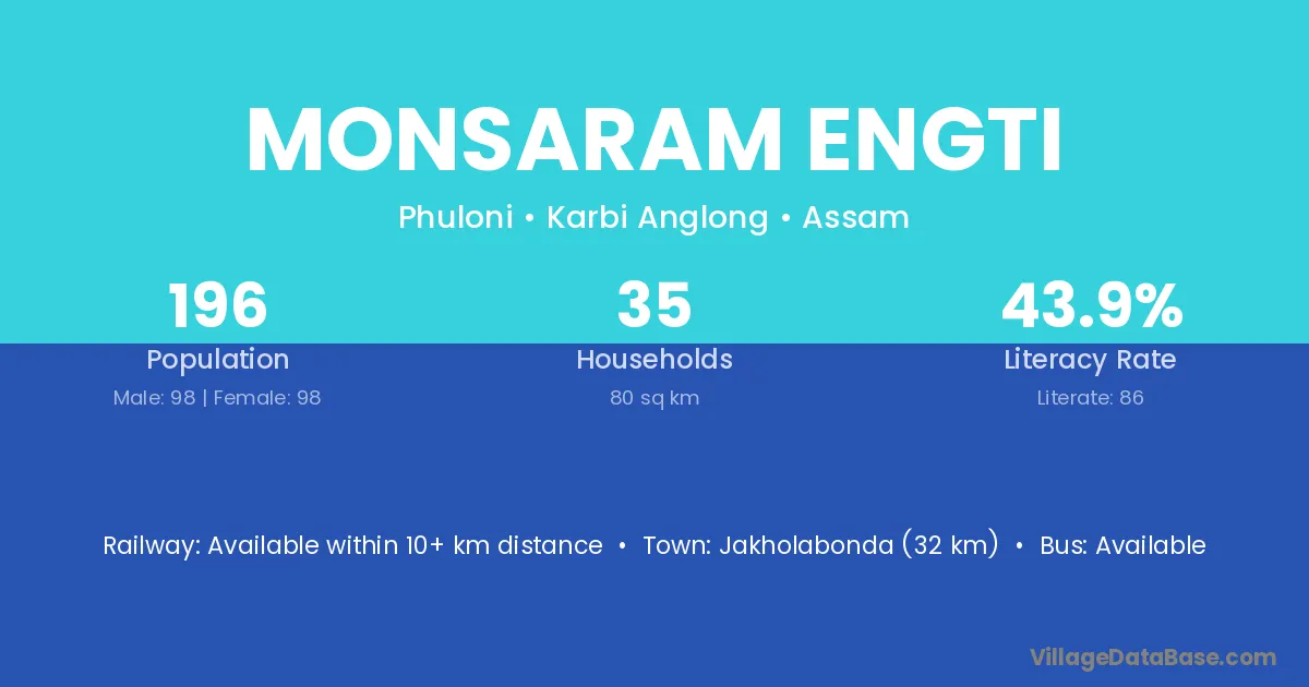 Jakholabonda (32 km) is the nearest town to Monsaram Engti village for major economic activities and is located approximately 32 km away.