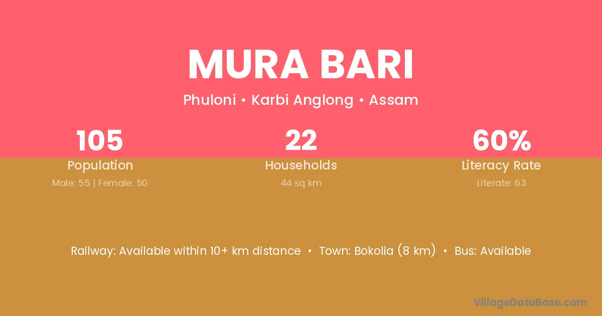 Bokolia (8 km) is the nearest town to Mura Bari village for major economic activities and is located approximately 8 km away.