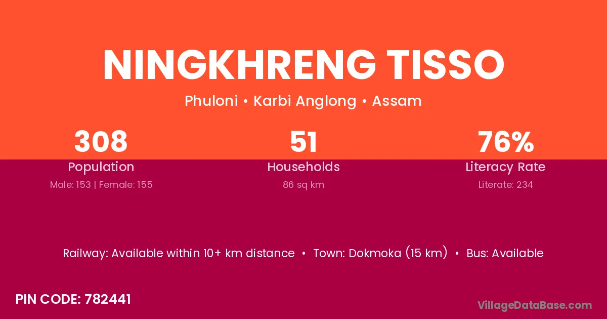 Dokmoka (15 km) is the nearest town to Ningkhreng Tisso village for major economic activities and is located approximately 15 km away.