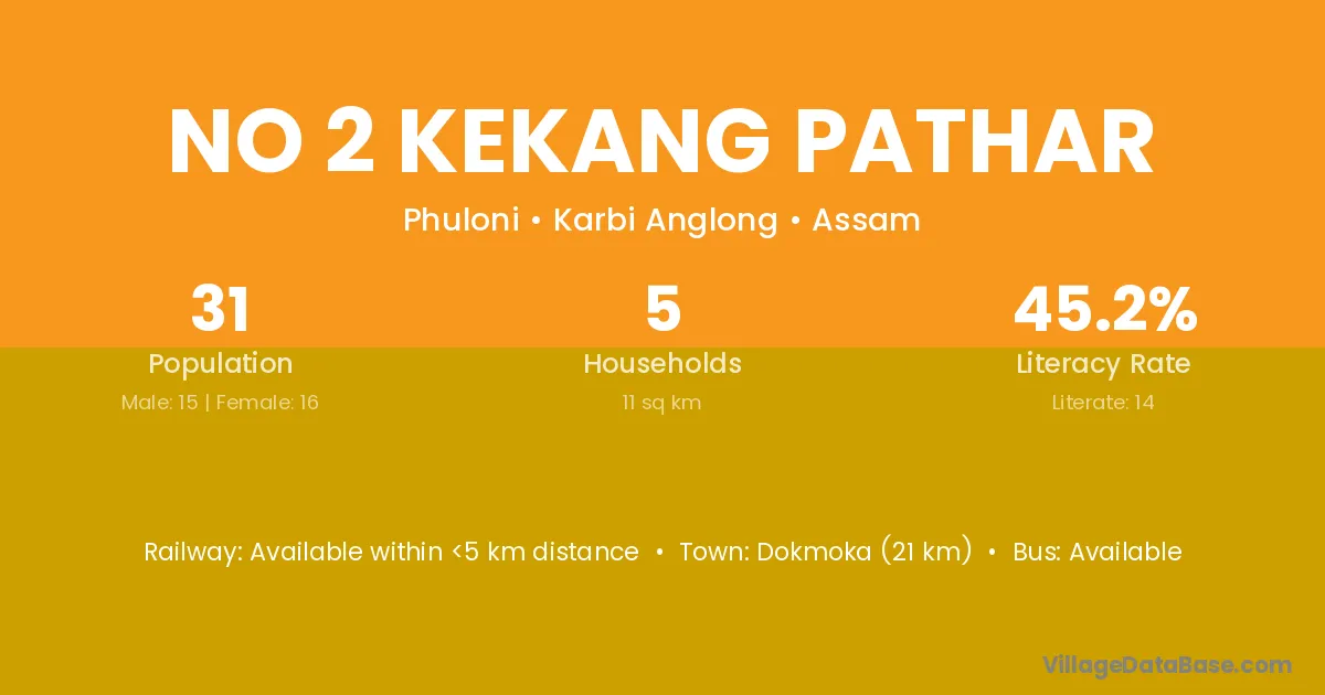 Dokmoka (21 km) is the nearest town to No 2 Kekang Pathar village for major economic activities and is located approximately 21 km away.