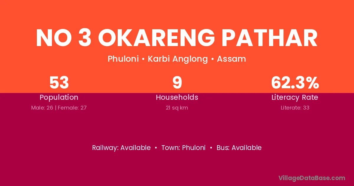 No 3 Okareng Pathar village has a total population of 53 people, of which 26 are males and 27 are females.