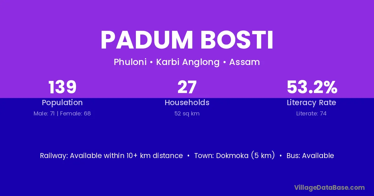 Padum Bosti village has a total population of 139 people, of which 71 are males and 68 are females.