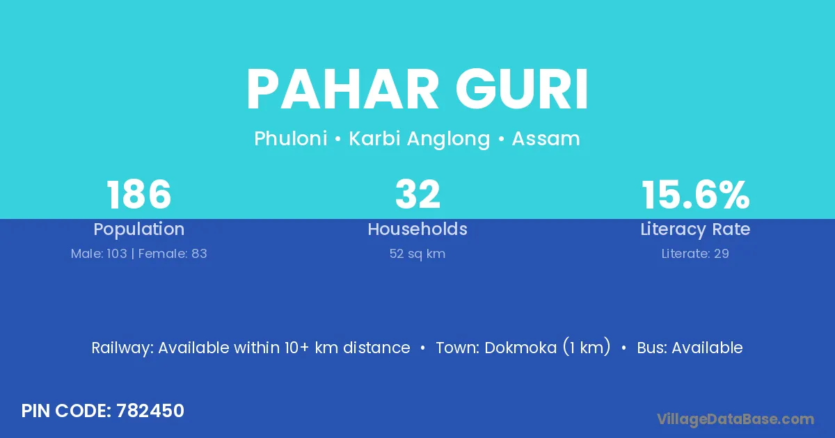 Dokmoka (1 km) is the nearest town to Pahar Guri village for major economic activities and is located approximately 1 km away.