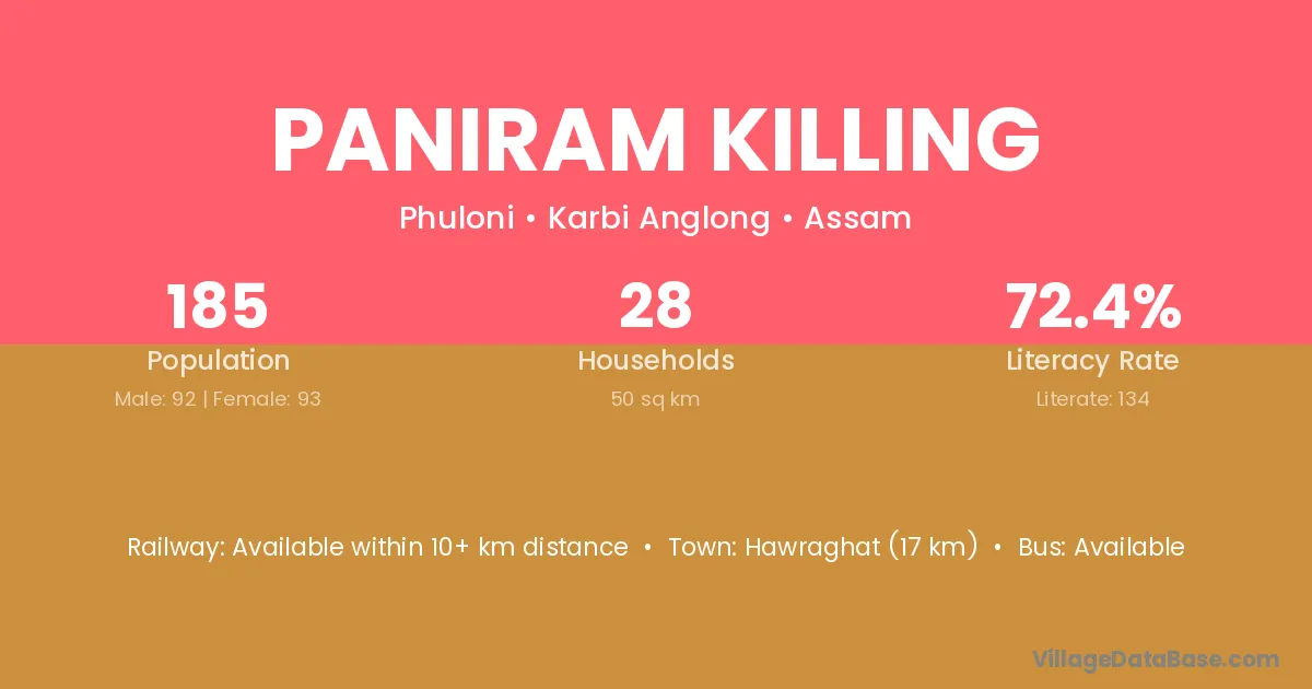 Paniram Killing village has a total population of 185 people, of which 92 are males and 93 are females.