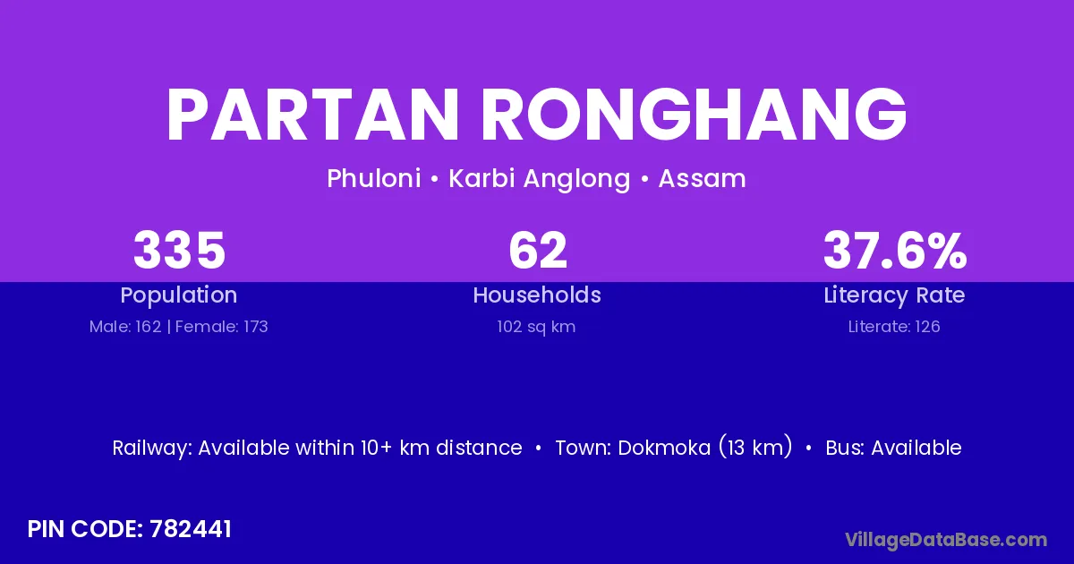 Dokmoka (13 km) is the nearest town to Partan Ronghang village for major economic activities and is located approximately 13 km away.