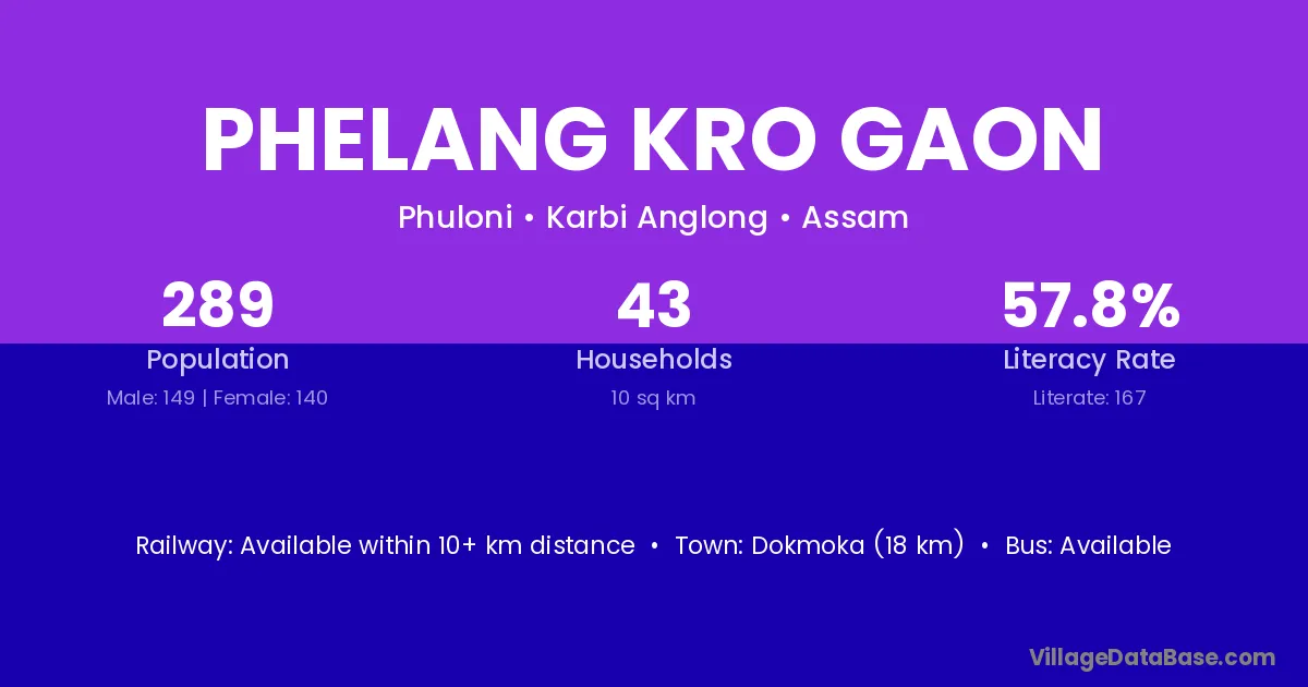 Dokmoka (18 km) is the nearest town to Phelang Kro Gaon village for major economic activities and is located approximately 18 km away.
