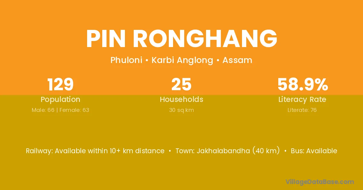 Jakhalabandha (40 km) is the nearest town to Pin Ronghang village for major economic activities and is located approximately 40 km away.