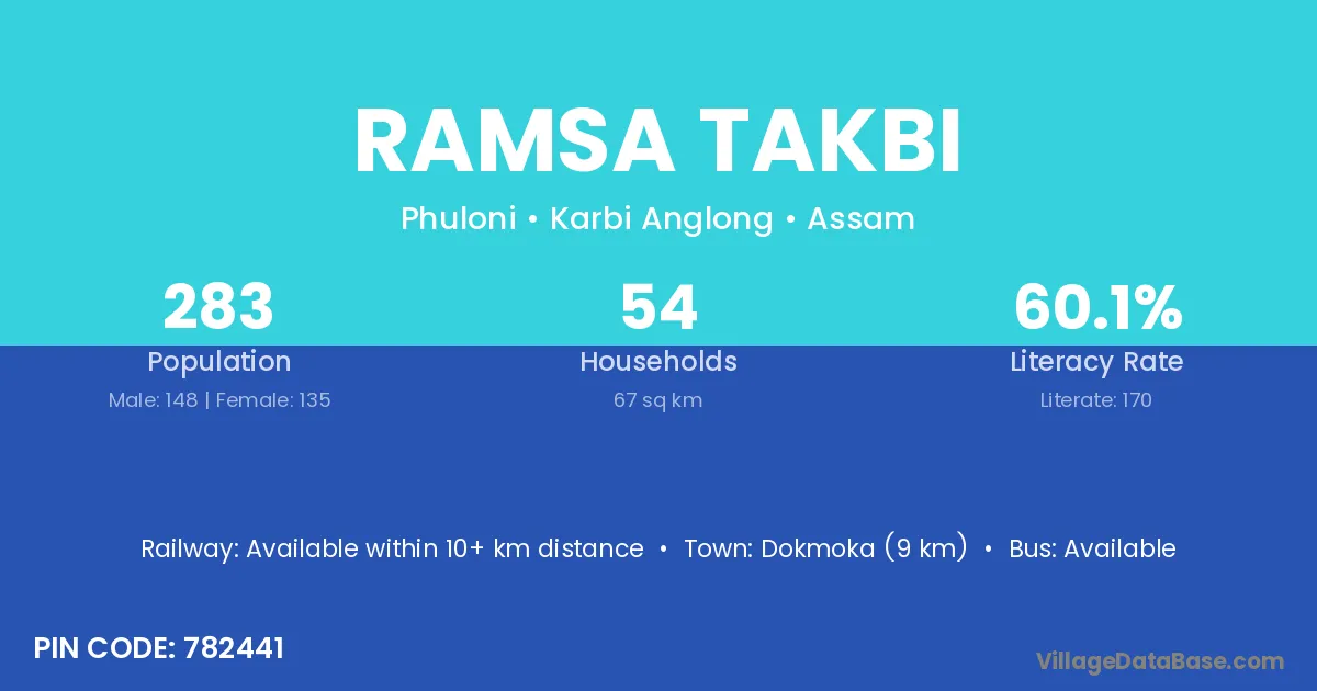 Dokmoka (9 km) is the nearest town to Ramsa Takbi village for major economic activities and is located approximately 9 km away.
